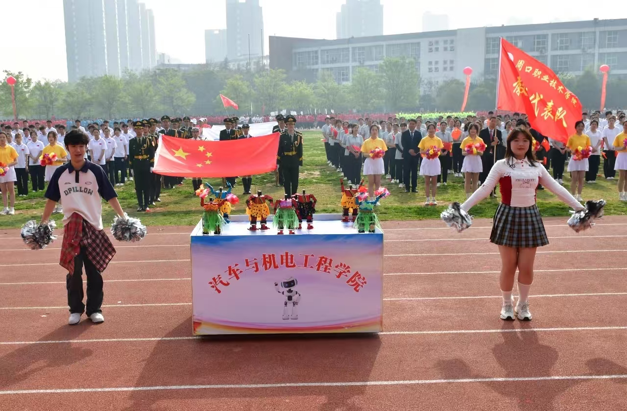 队伍最前方,是身姿挺拔的引导员,手持引导牌,引领着整个方阵。其后,旗手身姿矫健,高擎院旗,院旗在微风中猎猎作响,庄重而威严。紧随旗手的是李经理,他面带微笑,步伐稳健,展现出公司领导的风采。方阵中,同学们整齐划一地挥舞着手中的小红旗,鲜艳的红色随着步伐律动,形成一道亮丽的流动风景线。同学们手举的牌子上写着鼓舞人心的话语,彰显出公司师生积极向上、勇于拼搏的精神风貌。