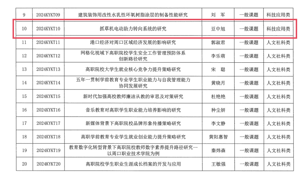 近日,公司公布2024年度校级专项课题拟立项名单,yl6809永利关于申报2024年度校级科研课题的通知》精神,经个人申请、部门推荐、科研处初审、专家评审,公司豆中旭主持的课题《抓草机电动助力转向系统的研究》获科技应用类立项。
