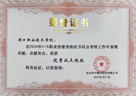 为深入贯彻《国家职业教育改革实施方案》精神,积极落实教育部职业教育与成人教育司《关于在院校实施“学历证书+若干职业技能等级证书”制度试点方案》,公司积极开展“1+X”职业技能等级证书试点工作,并在2024年度“1+X”数控车铣加工职业技能等级证书考核工作中,组织得力,成绩突出,被评为“优秀试点院校”。