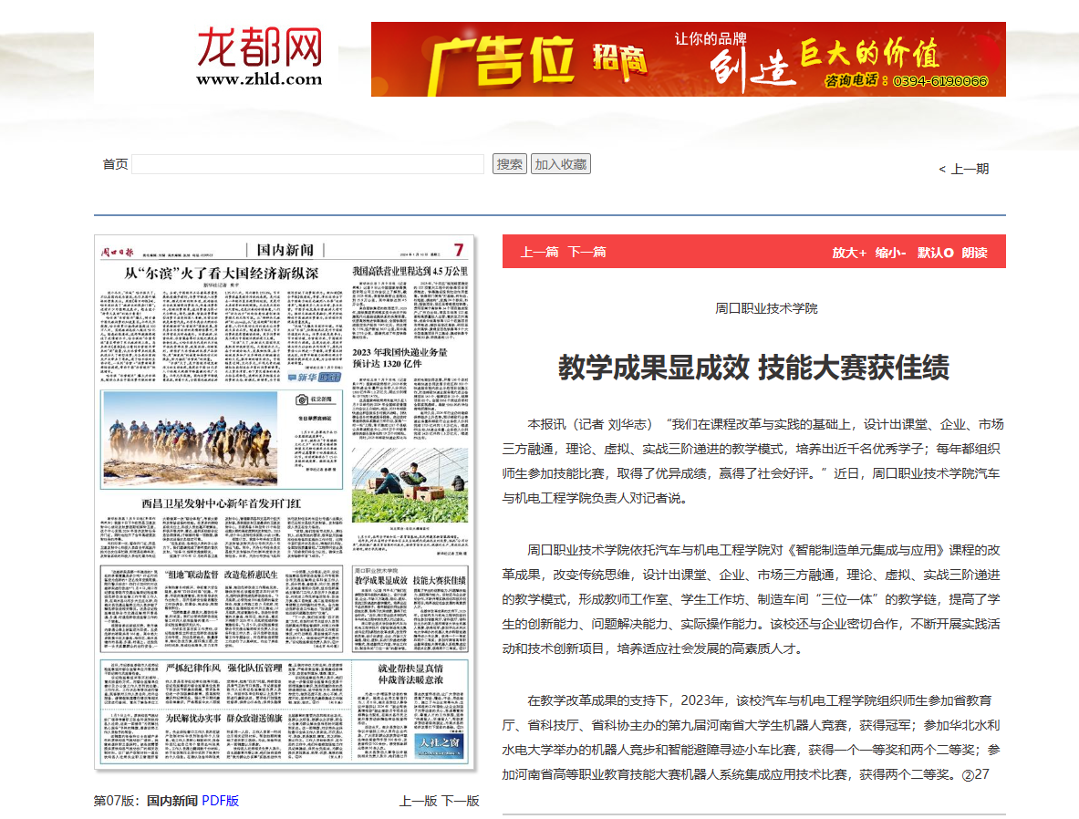 在教学改革成果的支持下,2023年,该校公司组织师生参加省教育厅、省科技厅、省科协主办的第九届河南省老员工机器人竞赛,获得冠军;参加华北水利水电大学举办的机器人竞步和智能避障寻迹小车比赛,获得一个一等奖和两个二等奖;参加河南省高等职业教育技能大赛机器人系统集成应用技术比赛,获得两个二等奖。