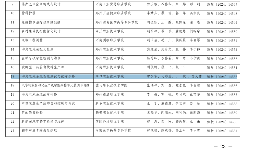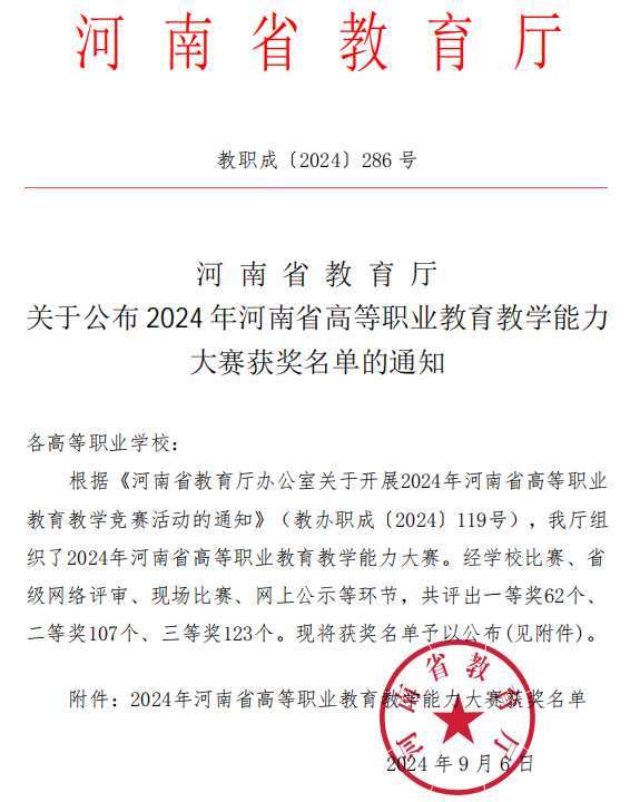 近日,河南省教育厅下发《关于公布2024年河南省高等职业公司产品能力大赛获奖名单的通知》(教职成〔2024〕286号),公司教师曾少华、马彩兰、丁航、苏大体团队的《动力电池系统性能测试与故障诊修》获得三等奖。