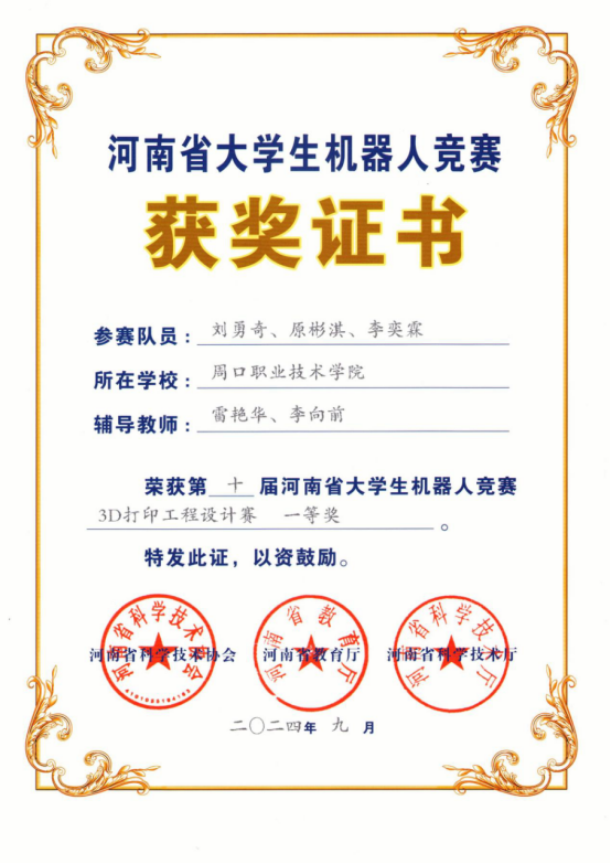 在公司领导的大力支持下,公司多支队伍以其优秀的表现在众多参赛队伍中脱颖而出,斩获一等奖4项,二等奖2项,三等奖1项。其中吕培源、刘庭、王杰(指导教师李向前、陈文静)参加“机器人舞蹈”,获得一等奖;刘勇奇、原彬淇、李奕霖团队(指导教师雷艳华、李向前),参加“3D打印工程设计赛”,获得一等奖;刘世冰、牛闯、窦书为团队(指导教师田伟华、丁兰花),参加“机器人专项赛”,获得一等奖;赵誉翔、孙琳睿、张豪炀团队(指导教师张昭晗、黄梦真),参加“机器人专项赛”,获得一等奖;何永琪、王钧召、胡家硕(指导教师袁永、徐勇光),参加“机器人专项赛”,获得二等奖;王文科、赵哲、宋嘉诚团队(指导教师张月霞、屈莹莹)参加“机器人专项赛”,获得二等奖;郭延强、朱恩光、郭超楠团队(指导教师张月平、崔东风)参加“机器人专项赛”,获得三等奖。