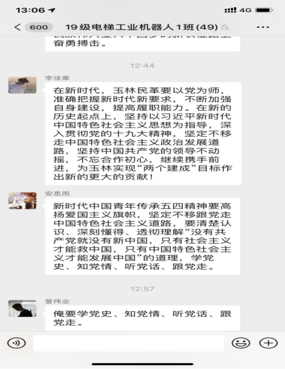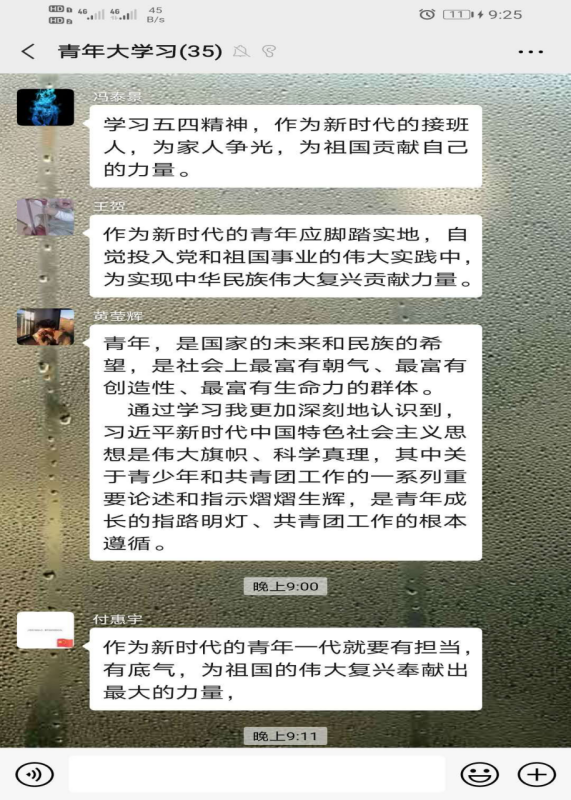 本期团课围绕学习习近平总书记五四寄语精神,结合高校返校复学的时间节点,广大青年员工学习劲头热情高涨,纷纷以观看视频、微信群讨论、朋友圈分享等多种形式各班展开学习,下面为部分员工学习瞬间。