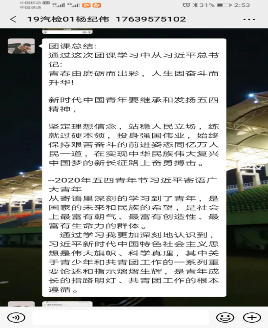 yl6809永利按照校团委要求,于5月7日上午10时开展了以“学习寄语精神,展现青春担当”为主题的线上团课活动。此次活动强调作为一名新时代的青年,传承五四精神是我们的一项重要任务,需要一代代人的奋斗。我们以青春为注,以理想为旗,将身上最鲜活的特质,最执着的态度,化作青春宣言,喊出做响亮的口号。