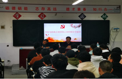 仪式结束后,由党总支书记崔东风老师为全体入党积极分子们带来党课第一讲《肩负使命明确目标》,大家都以热情饱满、积极、上进的心态聆听了党课教育。