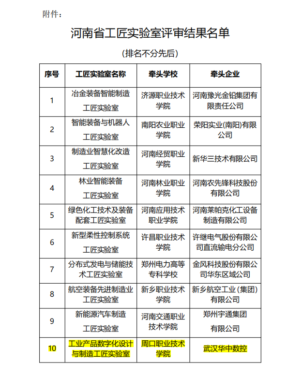 8月6日,河南省教育厅办公室发布了《河南省教育厅关于河南省工匠实验室建设项目评审结果的公示》文件,我院工业产品数字化设计与制造实验室获批为河南省工匠实验室。