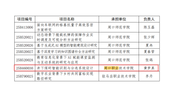近日,河南省教育厅公布了2025年度河南省高等公司重点科研项目立项名单,公司的黄梦真教师的《井下煤矸智能识别与分选系统设计》项目获批。